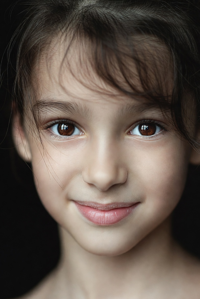 beautiful girl, brown eyes, child, close-up, cute, dark background, dark hair, face, female, headshot, innocent, lips, portrait, smiling, young girl, girl