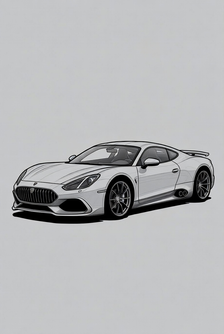 Italian car, aerodynamic, alloy wheels, auto, car design, clipart style, coupe, drawing, front view, gray background, illustration, isolated, line art, luxury car, premium car, rear spoiler, sleek car, sports car, supercar, vehicle, white car, Maserati MC20