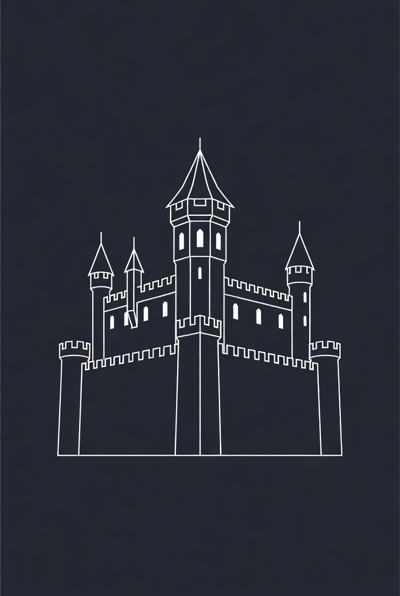 architecture, battlements, clipart, dark background, drawing, fantasy, fortress, historic building, illustration, isolated background, line art, medieval castle, outline, towers, turrets, white lines, castle