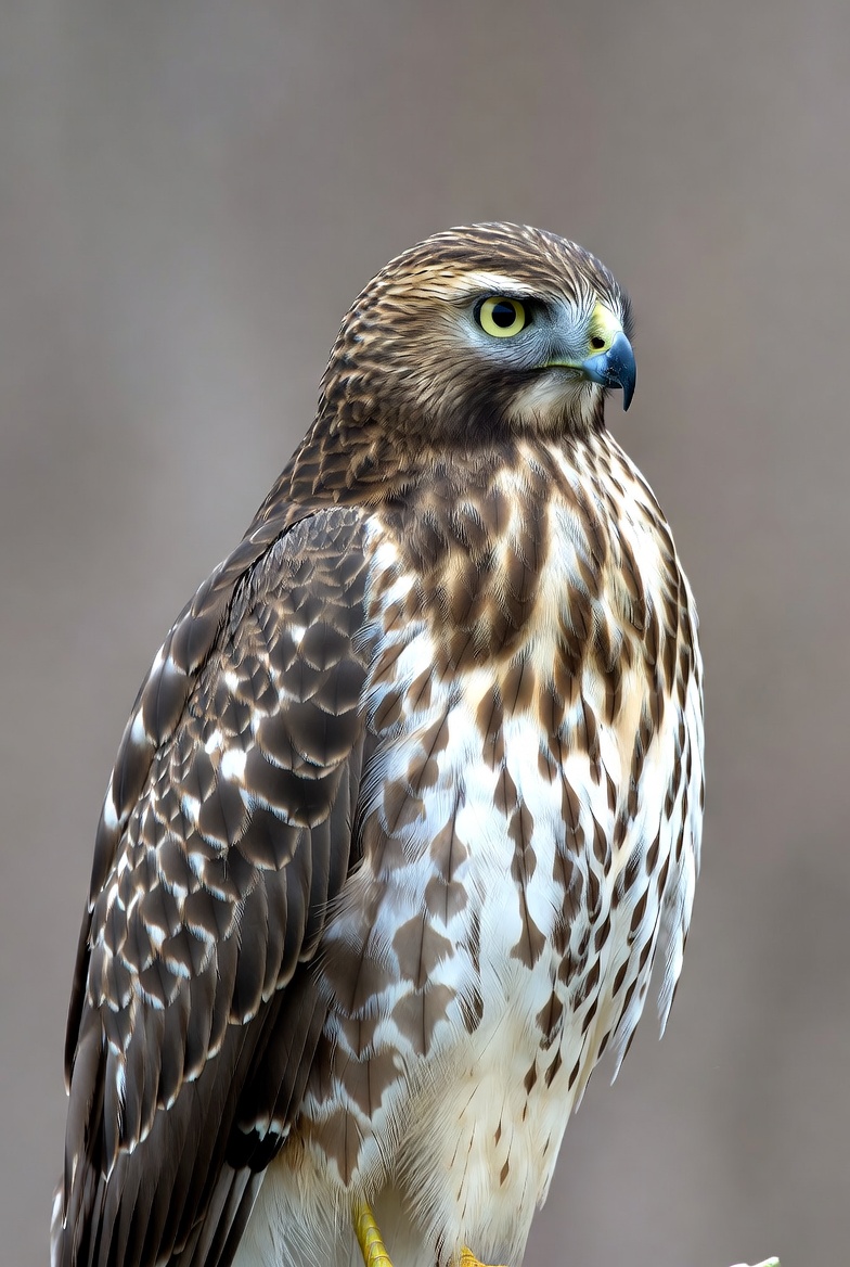 avian, bird, bird of prey, brown feathers, close-up, falconry, feathers, hawk, nature, perched, predator, raptor, sharp gaze, talons, white feathers, wild bird, wildlife, yellow beak, yellow eyes, red-tailed hawk