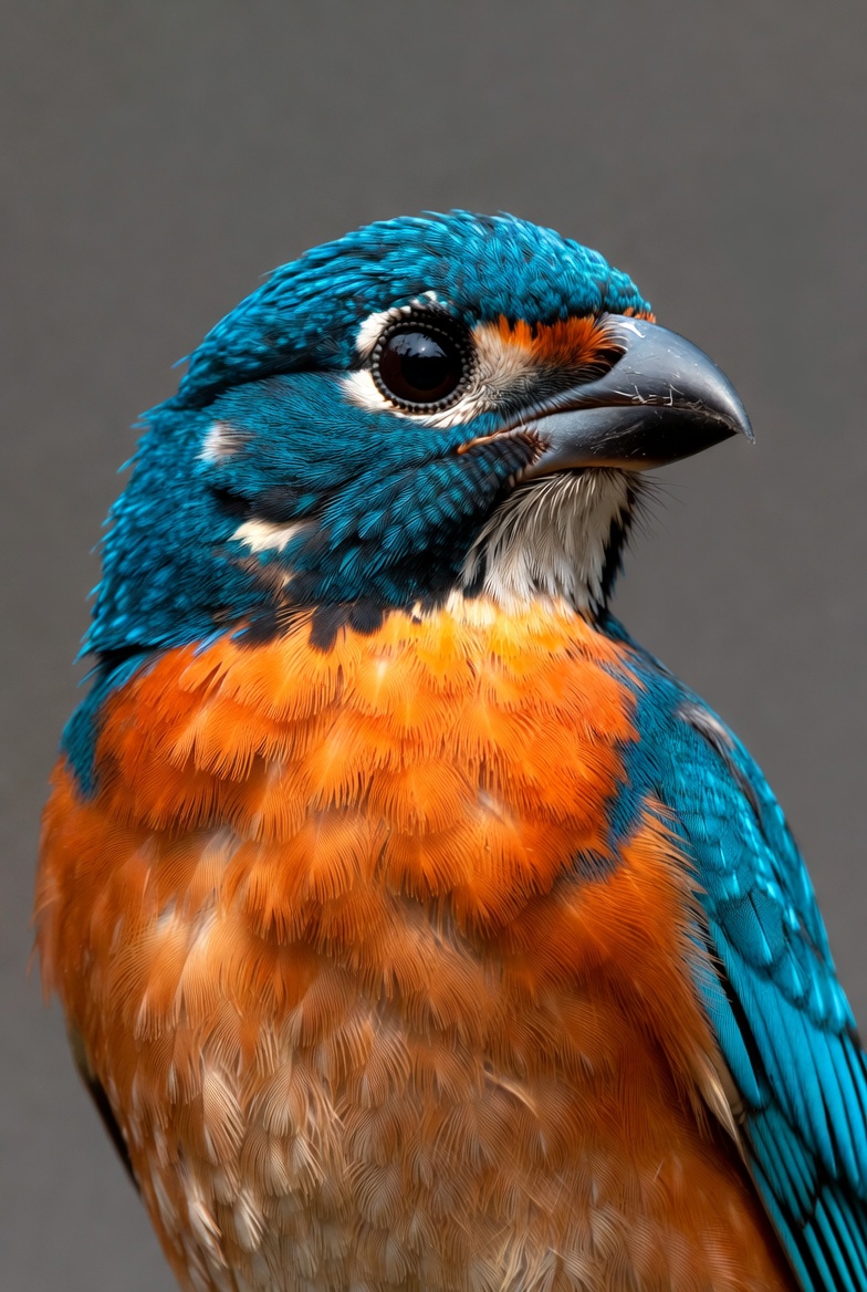A vibrant kingfisher bird with bright blue feathers on its head and back faces the camera against a gray background. Its underparts feature striking orange feathers, and it has a large black beak and large dark eyes. The detailed close-up highlights the intricate feather patterns and glossy sheen.