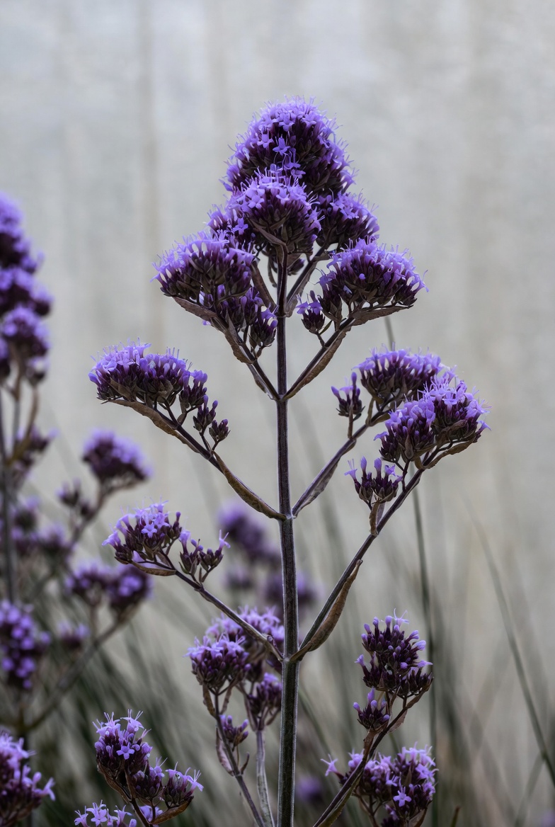 A tall cluster of vibrant purple agastache flowers stands prominently against a soft blurred grayish background. The flower head features numerous tiny purple florets densely packed on branching stems. Thin green grass blades are visible at the base.