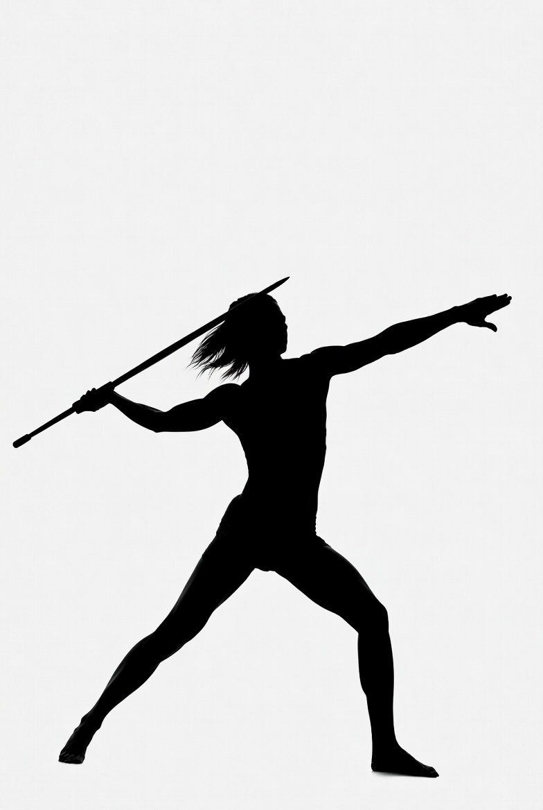 athletic pose, black silhouette, dynamic pose, female athlete, fitness silhouette, isolated background, javelin throw, javelin thrower, long hair, olympic athlete, sports silhouette, sportswoman, throwing javelin, track and field, white background, woman, silhouette