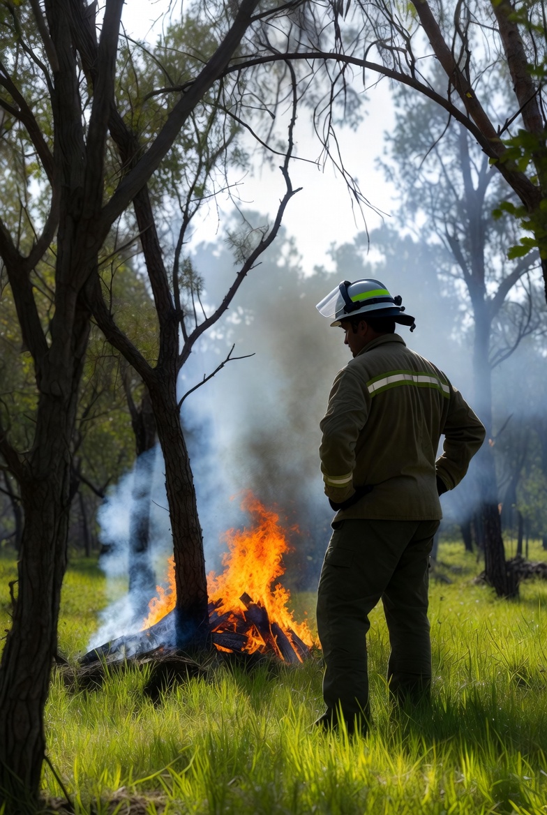 White, burning tree, bushfire, emergency, fire, flames, forest, forest fire, grass, green grass, hands on hips, helmet, male, observing, outdoors, protective gear, safety gear, smoke, smoke plume, standing, trees, wildfire, woods, yellow jacket, firefighter