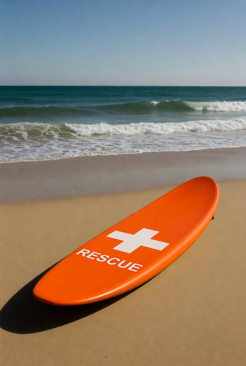 An orange rescue board with a white cross and 'RESCUE' text lies on the sandy beach near the ocean. Gentle waves crash in the background under a clear blue sky. The board is positioned parallel to the shoreline.