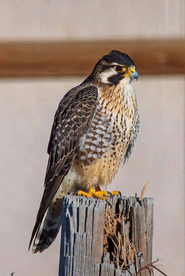 animal, bird, bird of prey, dark head, falcon, feathers, isolated background, nature, perched, raptor, speckled feathers, wildlife, wooden post, yellow beak, yellow legs, peregrine falcon