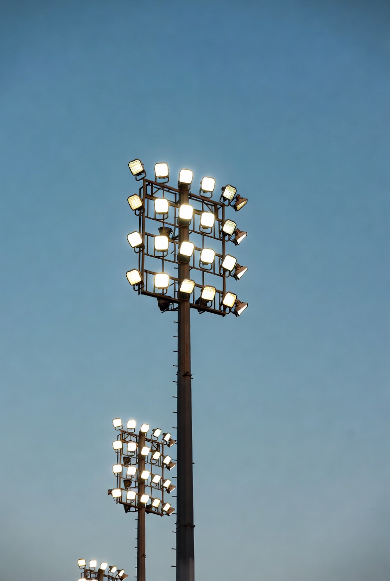 arena lights, blue sky, bright lights, field lights, flood light array, illumination, light poles, light tower, metal poles, night lighting, outdoor lights, sports field, sports stadium, stadium lights, floodlights