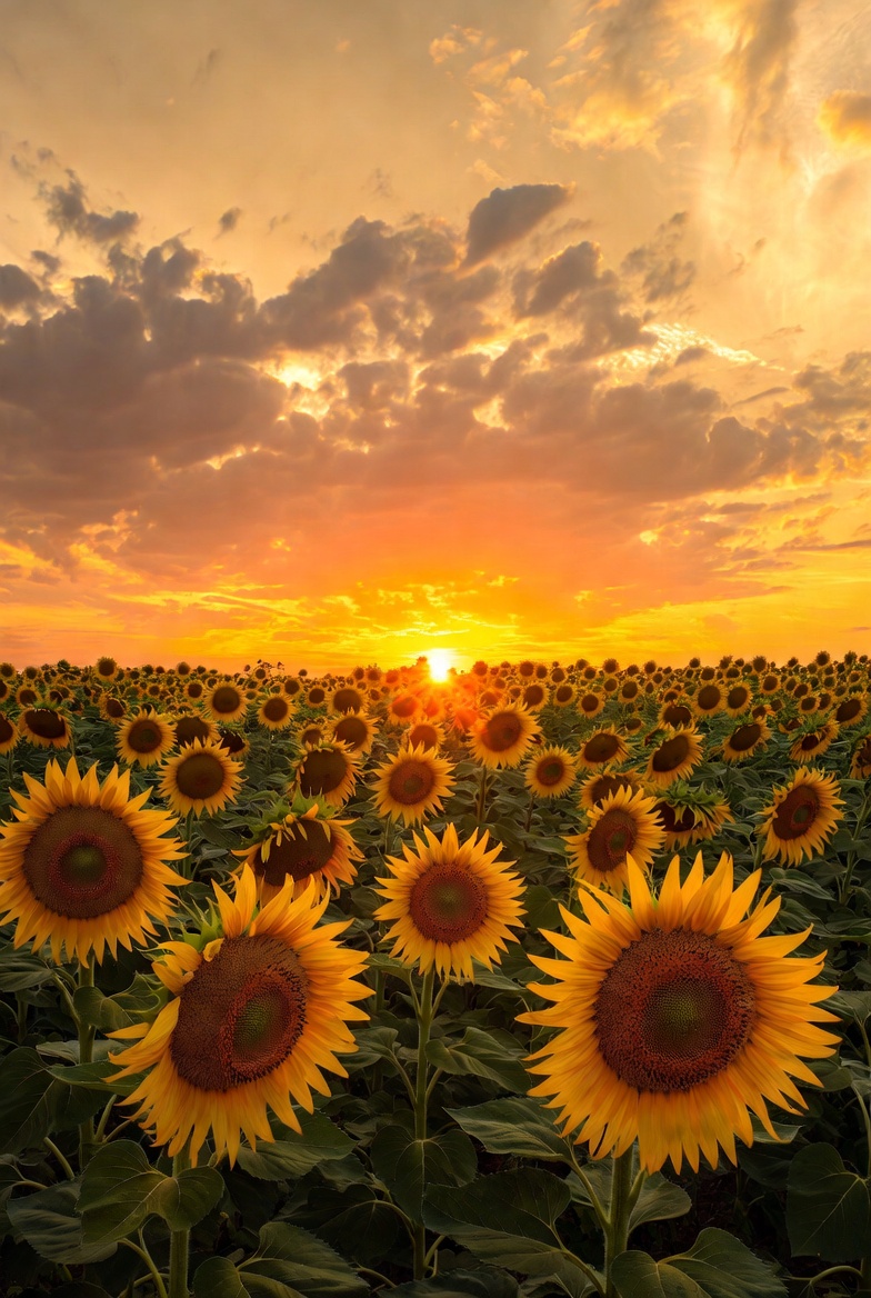 A vast field of sunflowers stretches towards a vibrant sunset sky filled with orange and yellow hues. The sunflowers face the glowing sun on the horizon, with their large yellow petals and dark centers prominent. Fluffy clouds add texture to the dramatic evening sky.