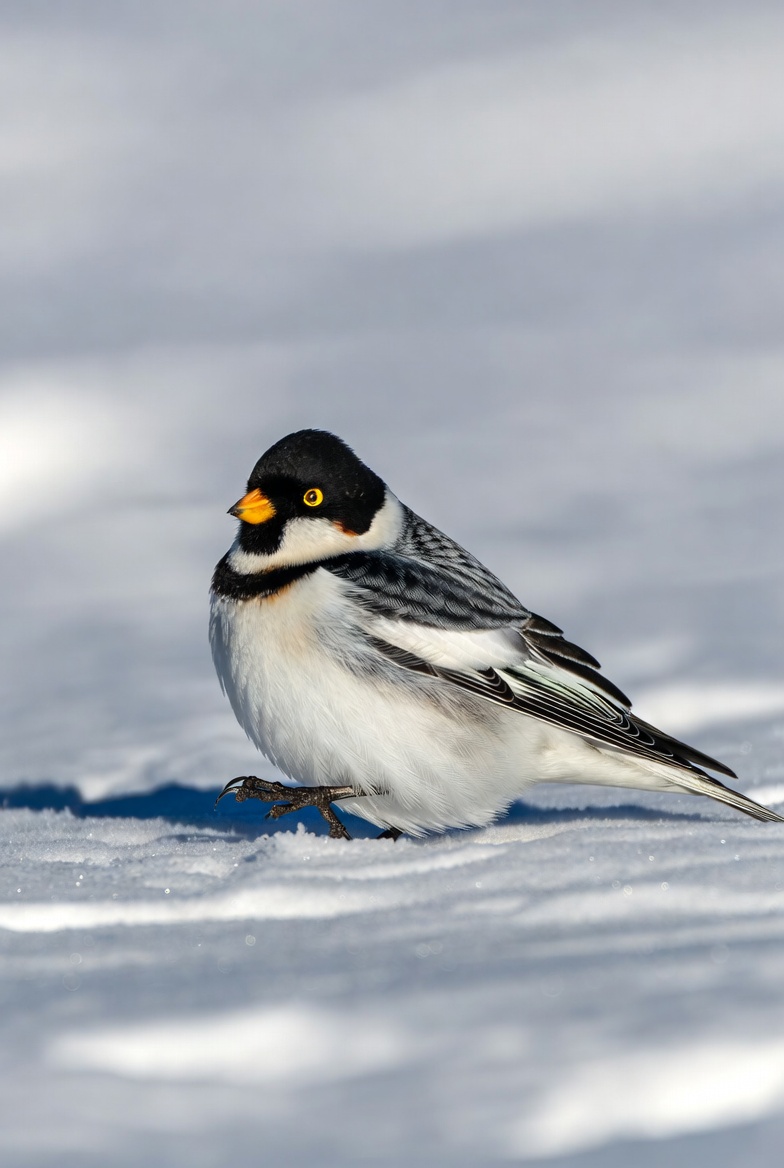 A snow bunting bird with black and white plumage and a bright yellow beak stands on a snowy ground. Its head features a distinctive black cap and eye patch, with grayish wings and white underbelly. The bird faces slightly to the side against a snowy white background.
