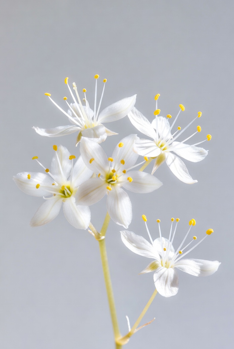 A cluster of delicate white star-shaped flowers blooms on a thin green stem. Each flower features numerous yellow-tipped stamens radiating from the center. The flowers are set against a plain gray background.