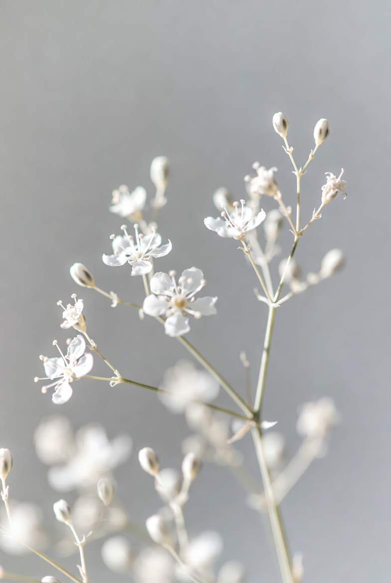 airy flowers, botanical, close-up, delicate blooms, floral, flower buds, flower cluster, gray background, gypsophila, nature, plant, seed pods, thin stems, tiny flowers, white flowers, white gypsophila, baby's breath