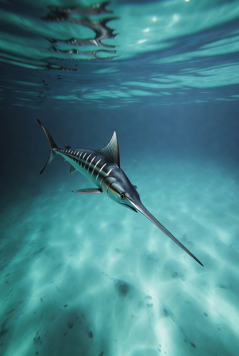 A blue marlin glides gracefully through clear turquoise ocean waters. Its long bill and striped body are sharply detailed against the blue underwater backdrop. Sunlight filters from above, illuminating the fish and rippling water surface.