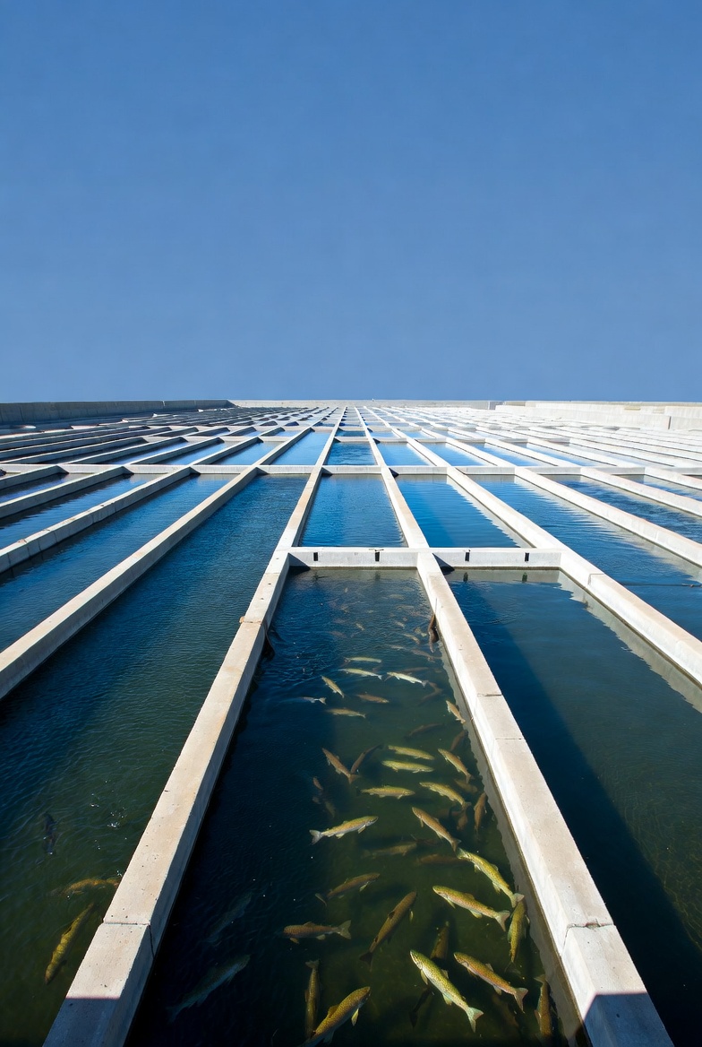 aquaculture, aquaculture facility, blue sky, concrete tanks, farm ponds, fish breeding, fish farming, fish in water, fish ponds, fish tanks, industrial fish farm, large fish farm, outdoor farm, pond rows, pond system, rows of ponds, swimming fish, water, water tanks, fish farm