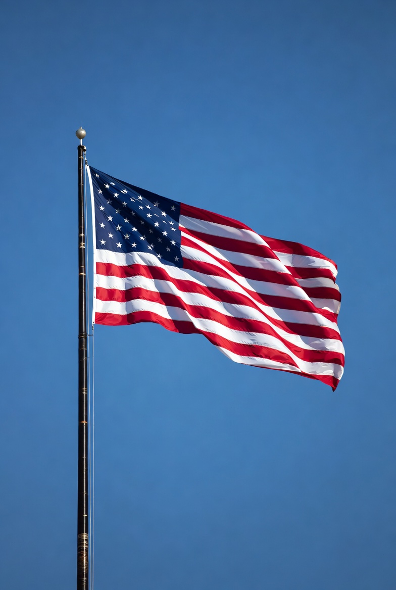 A vibrant American flag waves gently on a tall black flagpole against a clear blue sky. The flag features its iconic stars and stripes in red, white, and blue. It is captured from a low angle, emphasizing the pole and sky.