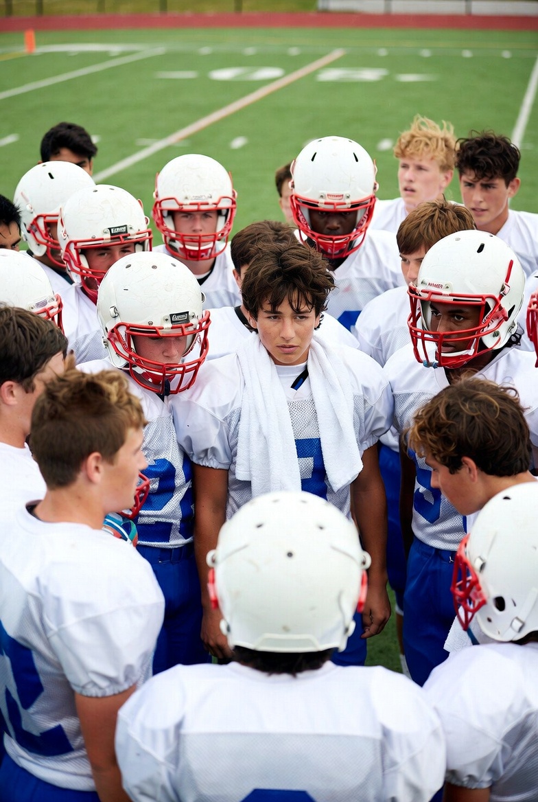 Latino, White, athletes, boys, field, football field, football players, game time, group, helmets, huddle, males, protective gear, red helmets, shoulder pads, sports, team huddle, towel, turf, uniform, white jerseys, young men, football team
