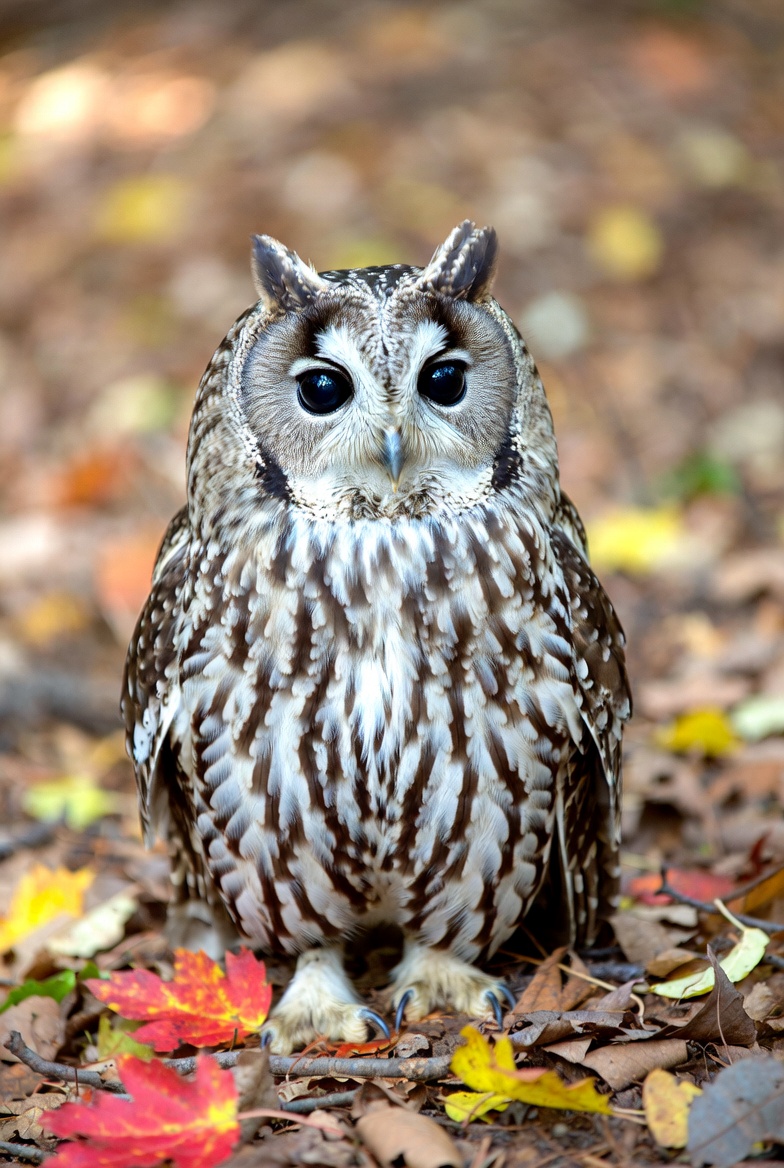 animal, autumn leaves, bird, brown feathers, ear tufts, fall foliage, feathers, forest floor, leaf litter, nature, outdoor, owl, raptor, sitting owl, striped plumage, white streaks, wild bird, wildlife, woods, yellow eyes, barred owl