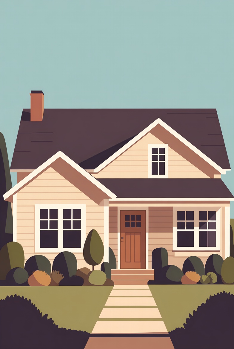 A minimalist illustration depicts a two-story beige house with white trim and a dark sloped roof. It features a brick chimney, a wooden front door, multiple windows, and a covered porch flanked by green shrubs. A stone pathway leads from the street through the front lawn to the house entrance against a light blue sky.