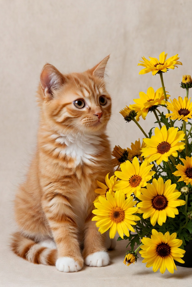 A cute orange tabby kitten sits on a beige background next to a vibrant bouquet of yellow daisies. The kitten has wide green eyes, white paws, and a fluffy tail. The flowers feature bright yellow petals and dark centers.