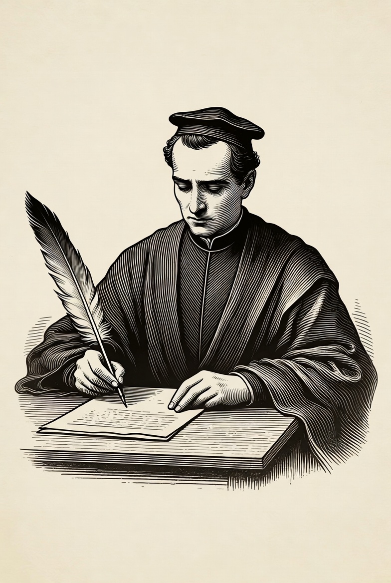 A historical illustration depicts a man in clerical robes and cap sitting at a wooden desk, writing on paper with a feather quill pen. He has a focused expression and dark hair, dressed in a long black robe with a high collar. The image is rendered in black ink line art style on a beige background.