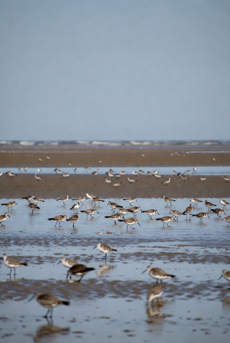 beach, birds, blue sky, coast, flock, foraging, group, low tide, mudflat, nature, outdoor, plovers, reflections, sandpipers, shallow water, tidal flat, wading birds, wetlands, wildlife, shorebirds