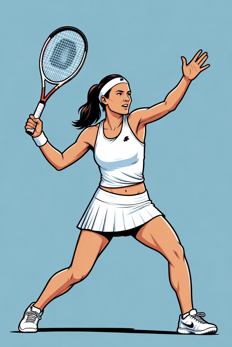 White, athlete, athletic pose, blue background, dynamic action, female, fitness, headband, illustration, ponytail, serving, sneakers, sportswear, tank top, tennis player, tennis racket, tennis serve, tennis skirt, wristband, woman