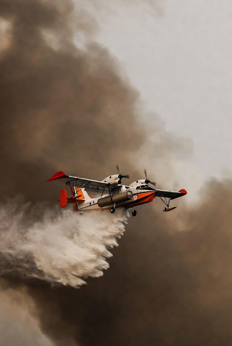 aerial, air tanker, aircraft, aviation, clouds, disaster response, emergency, firefighting aircraft, flying low, forest fire, orange plane, pontoon plane, seaplane, smoke, smoky sky, twin engine, water bomber, water drop, wildfire, firefighting plane
