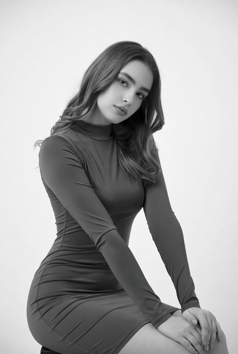 A young woman with long wavy brown hair poses sideways against a white background. She wears a form-fitting long-sleeved turtleneck dress in a dark shade. Her legs are crossed as she sits with hands resting on her knee.