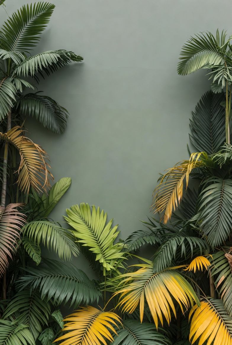 botanical, exotic plants, fronds, green leaves, green wall, greenery, indoor plants, isolated background, leaf texture, lush foliage, nature, palm fronds, palm tree, plants, tropical foliage, tropical plants, vertical composition, wall background, yellow leaves, palm leaves