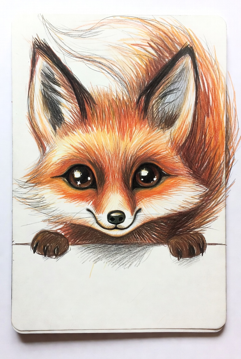 A detailed colored pencil drawing of a cute red fox with large expressive eyes and fluffy fur peeks over the white edge of the paper. The fox has perked ears, a smiling snout, and paws resting on the ledge. It is rendered in vibrant orange tones against an isolated white background.
