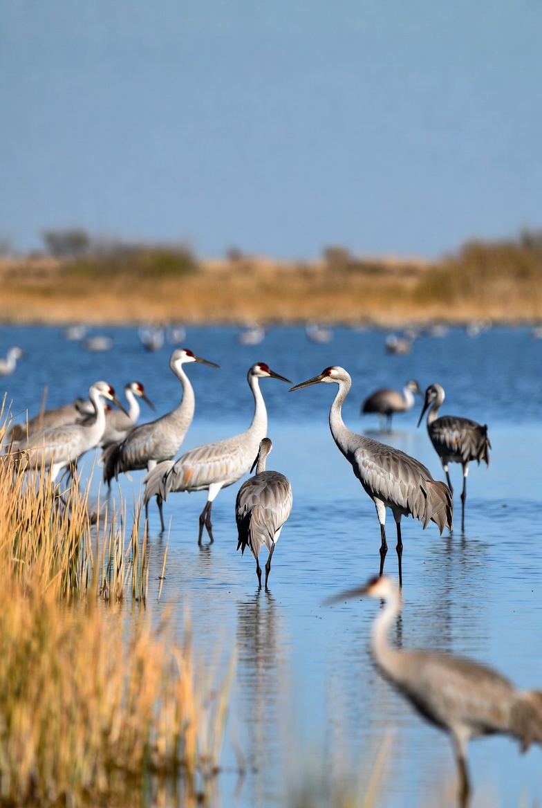 avian, bird group, birds, blue sky, cranes, flock, grass, gray birds, marsh, migration birds, nature, red crowns, reeds, shallow water, standing birds, tall birds, water, wetlands, wildlife, sandhill cranes