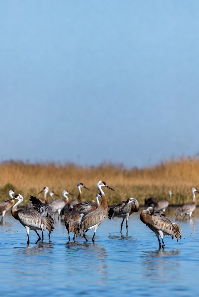 animal group, bird photography, birds, blue sky, brown feathers, cranes, flock, golden reeds, habitat, long legs, marsh, nature, outdoor, red crown, reeds, shallow water, standing birds, water, wetland, wildlife, sandhill cranes
