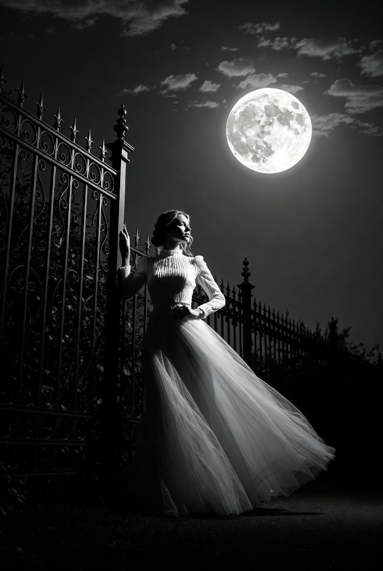 White, blonde hair, clouds, darkness, dress, elegant, female, fence, flowing dress, full moon, gown, leaning pose, long sleeves, moonlight, night sky, outdoor, silhouette, tulle skirt, wrought iron gate, woman