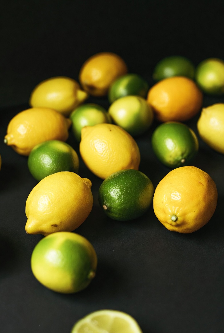 black background, citrus fruits, food photography, fresh fruit, fruit arrangement, fruit pile, green limes, limes, ripe lemons, sliced lime, still life, vibrant colors, whole fruits, yellow lemons, lemons