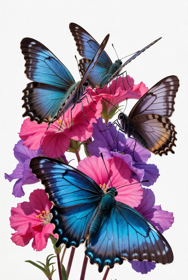 beautiful butterflies, blue butterflies, butterfly cluster, colorful wings, floral, flower cluster, insects, isolated background, macro photography, nature, pink flowers, purple flowers, vibrant colors, wings, butterflies