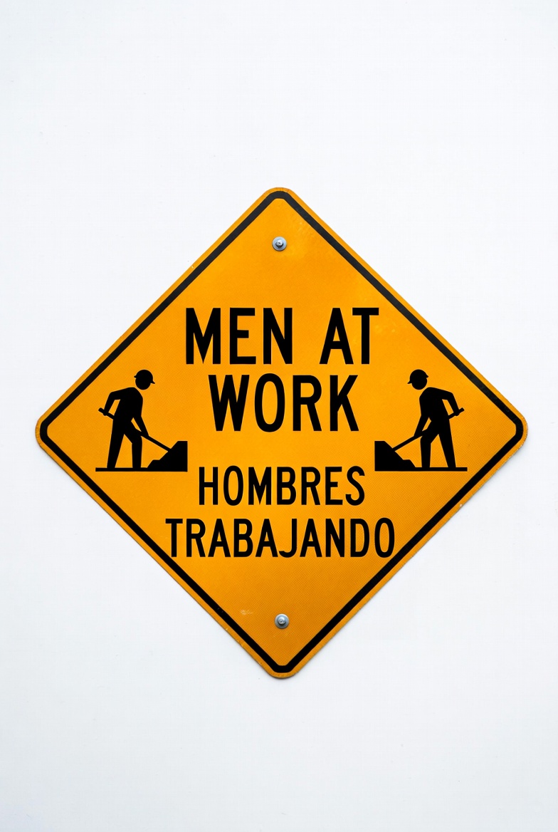 English Spanish, bilingual sign, construction sign, construction workers, diamond sign, male, men, road sign, safety sign, shoveling, silhouettes, traffic sign, warning sign, work zone, workers, yellow sign, men at work