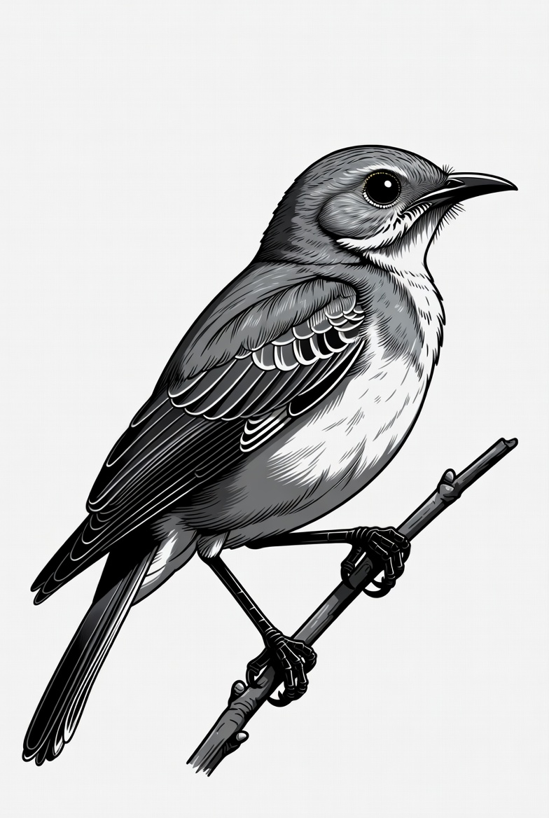 A detailed grayscale illustration of a small gray bird with white underbelly perches on a thin branch. The bird features a curved beak, large expressive eyes, and intricate feather details on its wings and tail. It stands against a plain white background.