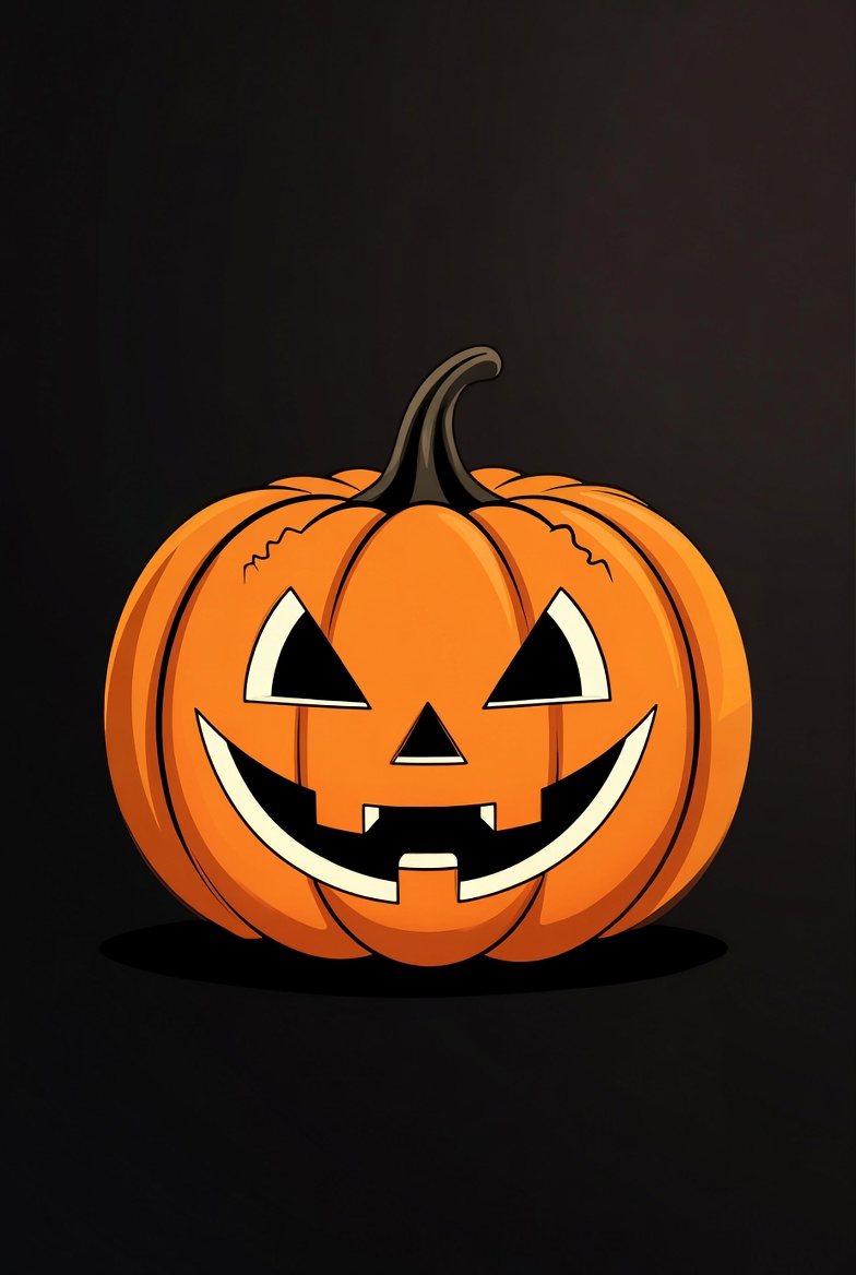 A carved orange jack-o'-lantern pumpkin with glowing triangular eyes, nose, and jagged smiling mouth sits centered on a solid black background. The pumpkin has a curved brown stem on top and subtle shadows beneath it. The illustration features bold outlines and vibrant Halloween colors.