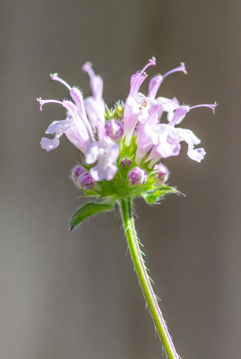 A closeup of a pink beebalm flower with numerous tubular petals arranged in a clustered head. The flower features light purple-pink blooms emerging from green bracts and a slender green stem. It is isolated against a blurred gray background.