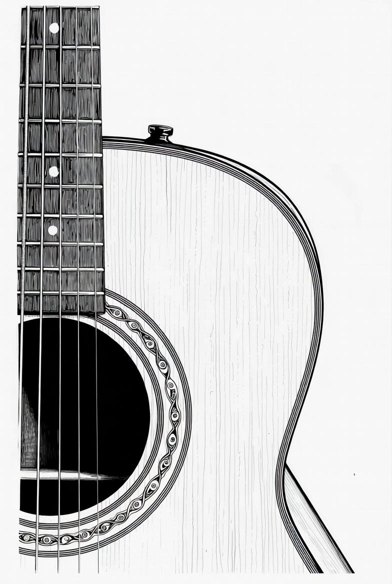 A detailed black and white illustration of an acoustic guitar shows a closeup view of the neck, body, and sound hole. The wooden grain and strings are finely rendered with intricate line work. It is isolated on a white background.