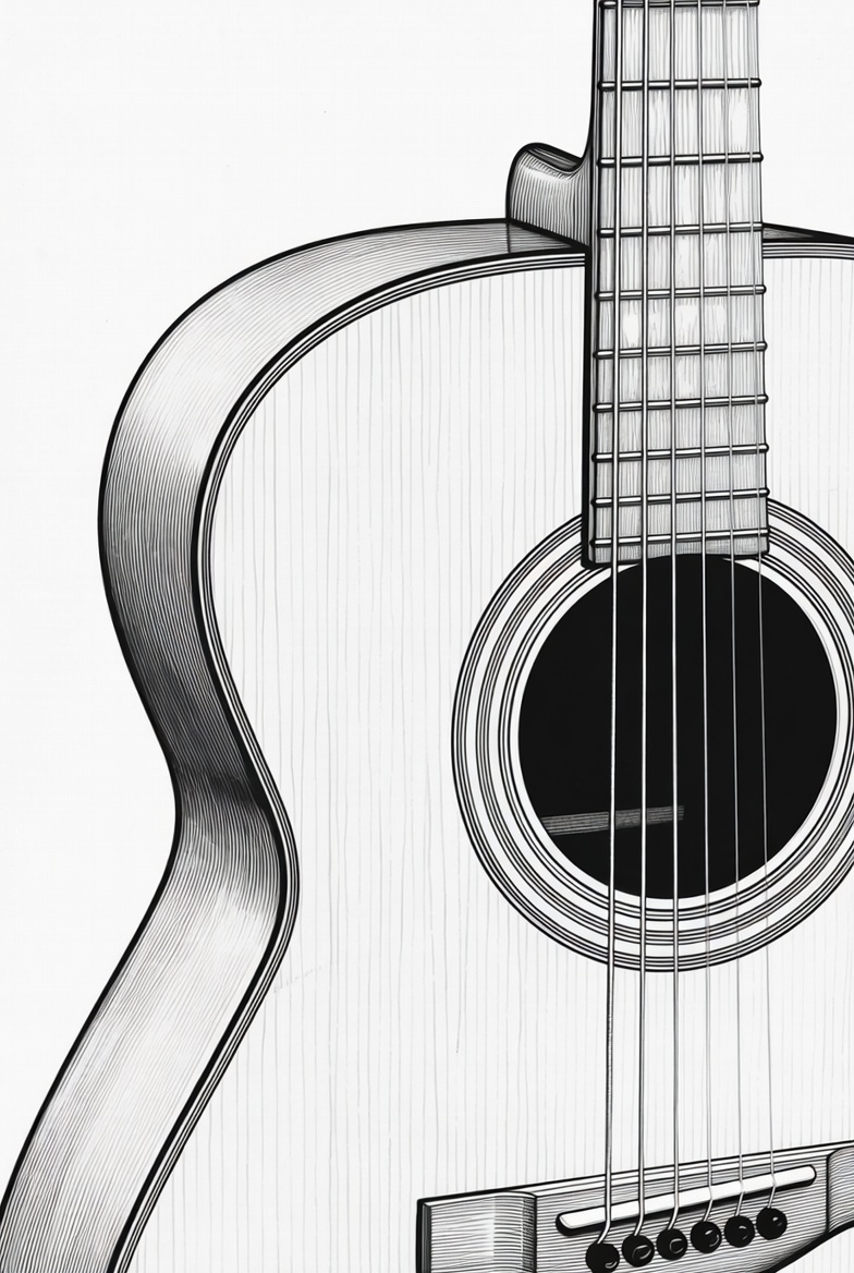 body, bridge, drawing, frets, guitar, illustration, isolated background, music, musical instrument, neck, pencil sketch, sketch, sound hole, strings, tuning pegs, wood grain, acoustic guitar