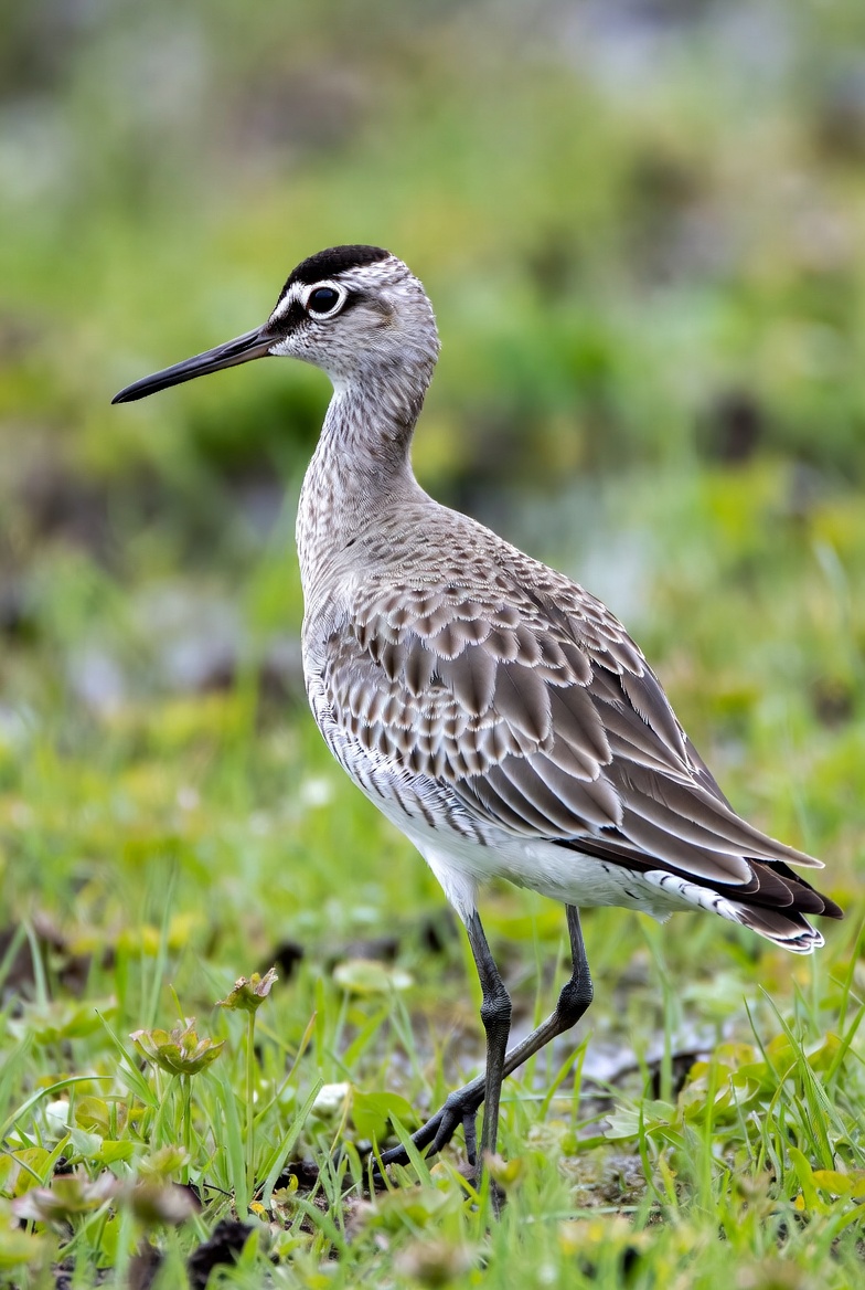 avian, bird, birdwatching, brown plumage, curved bill, eye stripe, feathers, grass, gray bird, green grass, habitat, legs, long bill, marsh, nature, outdoor, shorebird, standing bird, wader, wild bird, wildlife, wings, whimbrel