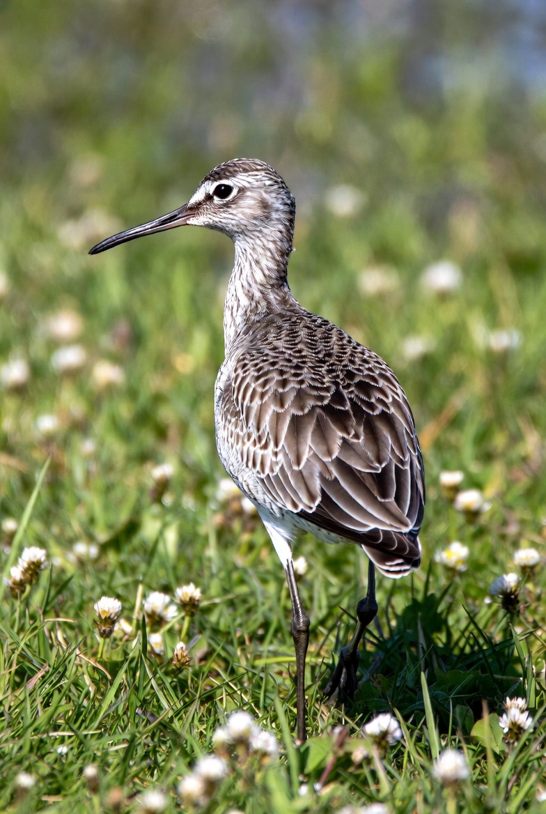avian, bird, brown bird, feathers, field, green grass, habitat, legs, long beak, marsh, nature, outdoor, sandpiper, shorebird, speckled feathers, standing bird, wading bird, white flowers, wildlife, whimbrel