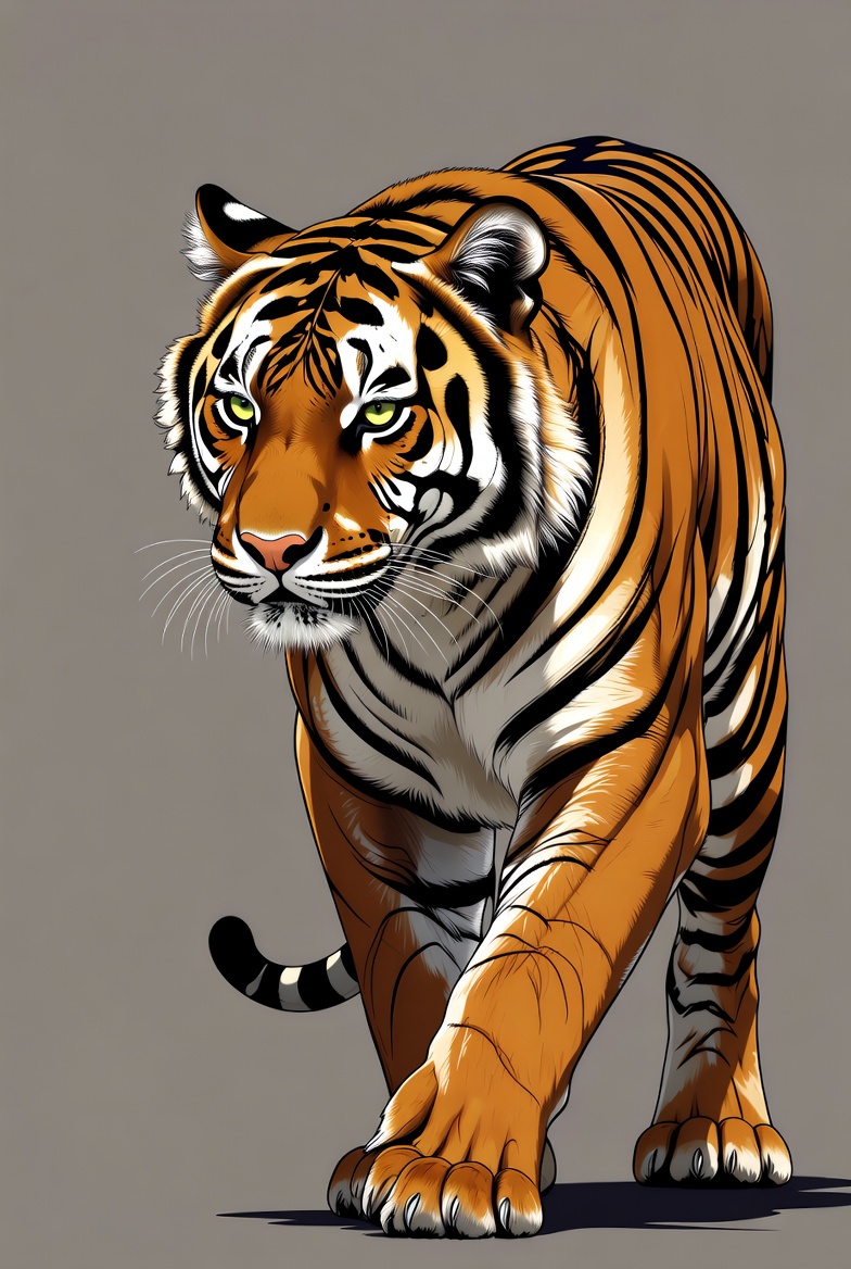 A detailed digital illustration of a tiger walking forward on a gray background. The tiger has vibrant orange fur with black stripes, piercing green eyes, and white accents on its underbelly and whiskers. Its muscular body is captured in a dynamic prowling pose with paws extended.