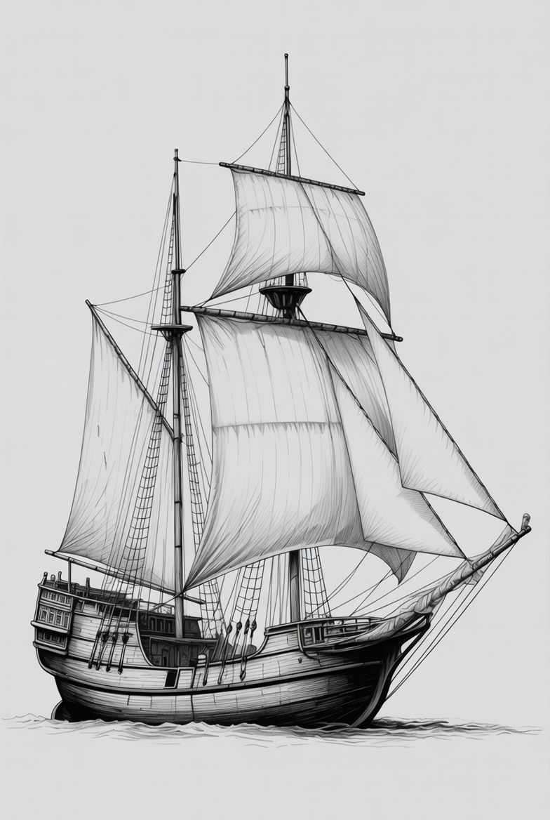 A detailed black and white illustration of a classic sailing ship with multiple masts and billowing sails. The ship features intricate rigging and wooden hull details, floating on calm water. It is depicted from a side angle against an isolated white background.
