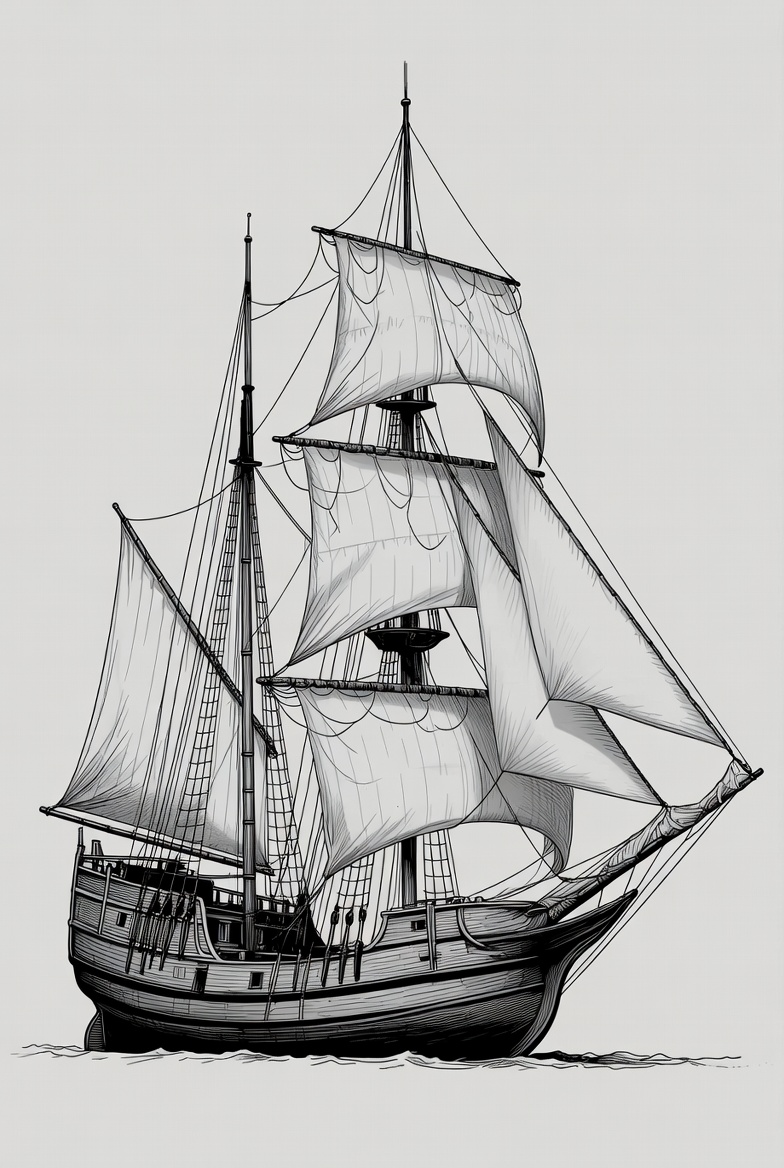 A detailed black and white illustration of a classic sailing ship with multiple masts and billowing sails. The ship features intricate rigging and wooden hull details, depicted on a calm sea with gentle waves. It is rendered in a realistic sketch style on a light gray background.