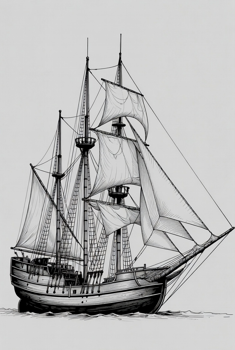 A detailed black and white illustration of a classic sailing ship with multiple masts and billowing sails. The ship features intricate rigging and is depicted on calm waters. It has a traditional wooden hull and is shown from a side angle against an isolated background.
