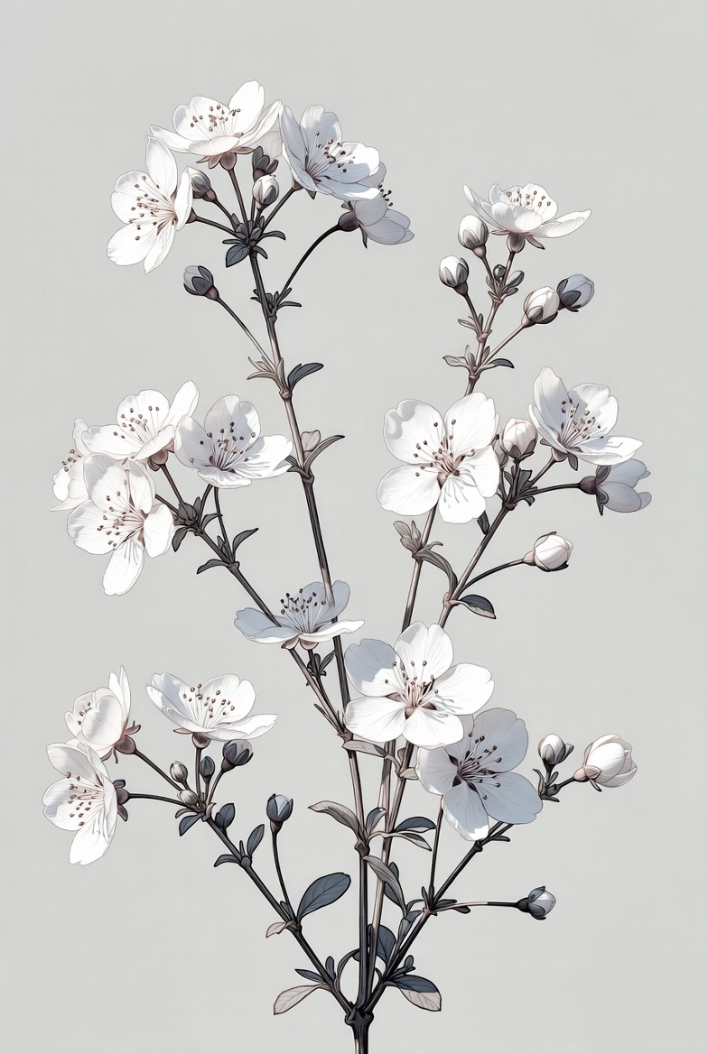 A cluster of delicate white spirea flowers blooms on thin gray stems and branches. Tiny buds dot the branches amid the open blossoms. The arrangement is isolated against a smooth gray background.