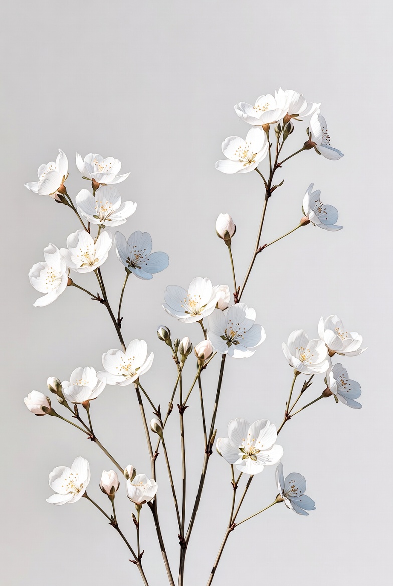 Delicate white cherry blossoms with pink buds cluster on thin branches. The flowers are arranged against a plain light gray background. Soft lighting highlights the petals and stems.