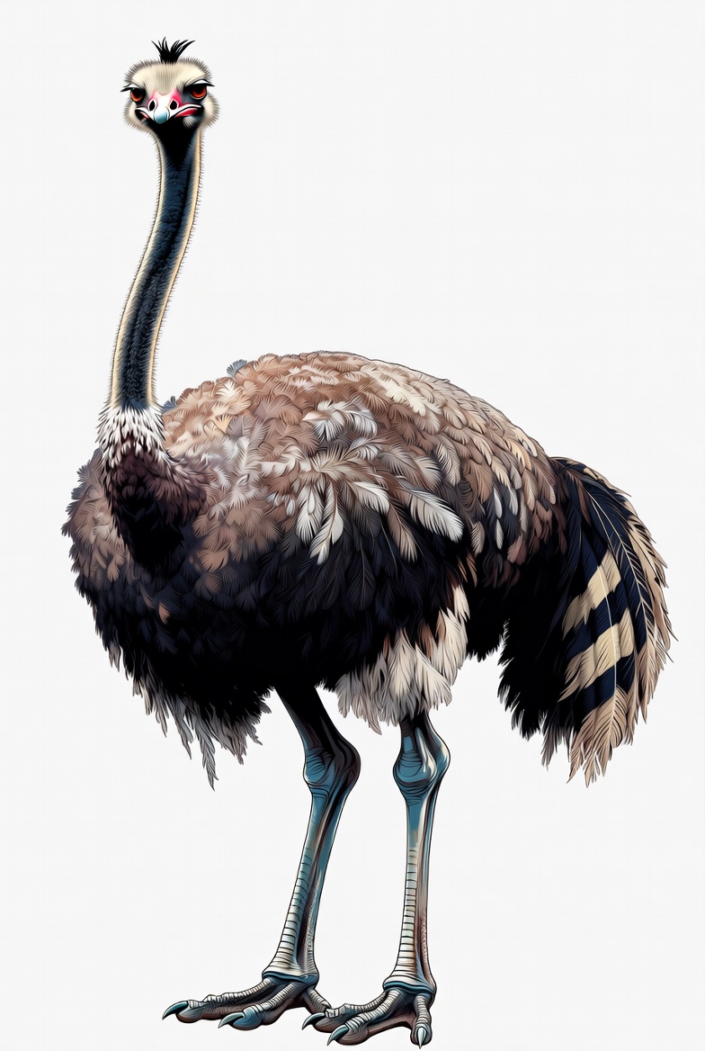 A colorful cartoon ostrich stands on a white background with exaggerated features. It has a long neck, large red eyes, fluffy brown feathers, black wings, and striped tail feathers. The ostrich's blue legs end in wide feet.