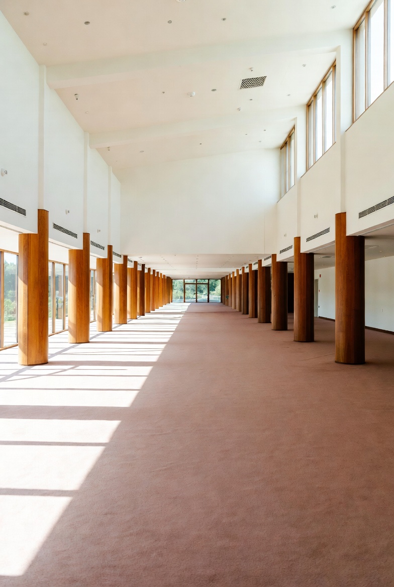 A spacious empty hall features tall wooden columns lining both sides of a long carpeted floor. Large windows allow sunlight to stream in, casting long shadows across the pinkish carpet. The high ceiling and minimalist white walls create an open, airy atmosphere.